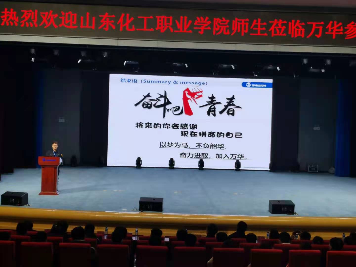学院参观团队受到万华化学领导的隆重欢迎和热情接待。万华人力资源部经理白朔主持欢迎仪式,高级人力资源经理郭少杰等参加欢迎仪式,万华化学高级人力资源总监赵继德在欢迎仪式上亲自致辞,并向师生介绍万华化学的发展概况;校友代表2008级应用化工技术毕业生李忠向老师和师弟师妹们介绍在万华化学的成长经历,发言中表示感谢学院的教育培养,珍惜万华的发展平台,感恩老师当年把他推荐到万华,发言贯穿满满的幸福感;连晓亮处长代表学院团队致答谢辞。