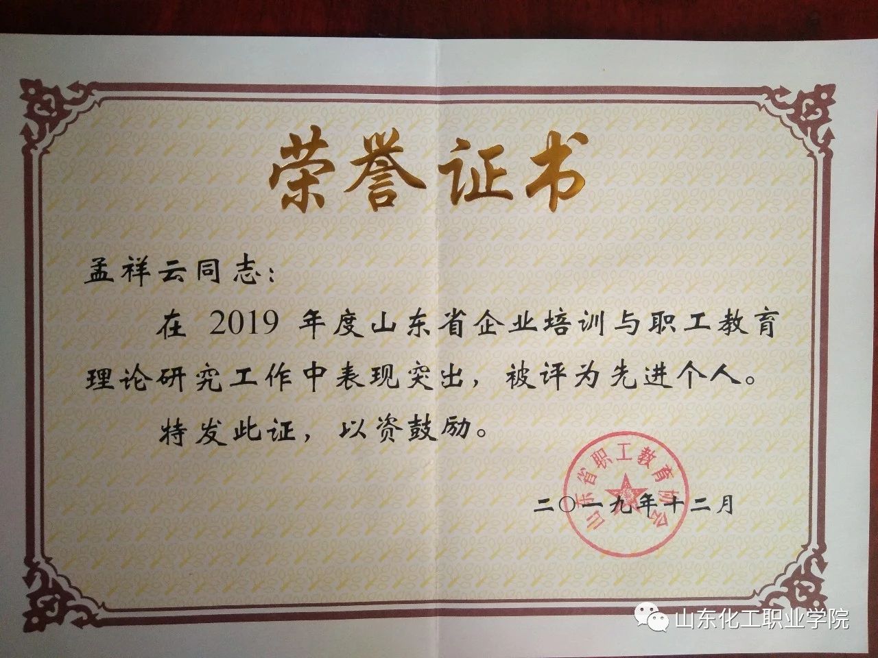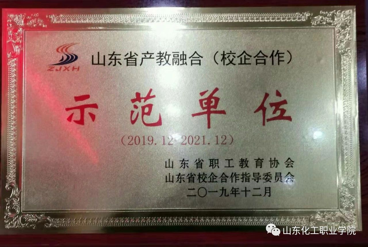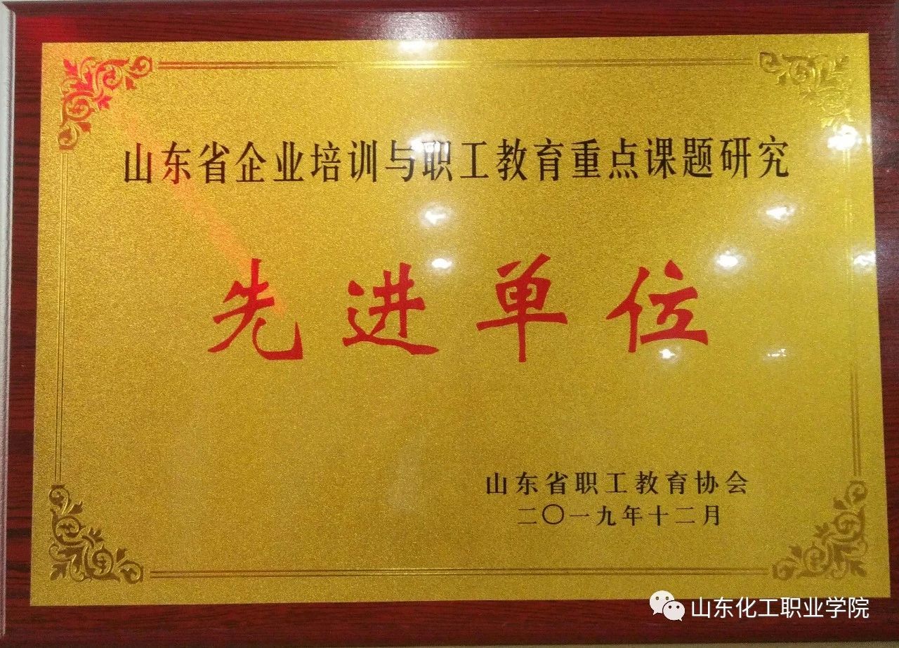 12月27日,山东省职工教育协会、山东省校企合作指导委员会联合通报表彰了2019年山东省产教融合(校企合作)示范单位、山东省职工与职业教育领军人物、山东省产教融合(校企合作)示范性品牌专业、山东省企业培训与职工教育重点课题研究工作先进单位、山东省企业培训与职工教育重点课题研究工作先进个人,山东化工职业学院获得多项荣誉。