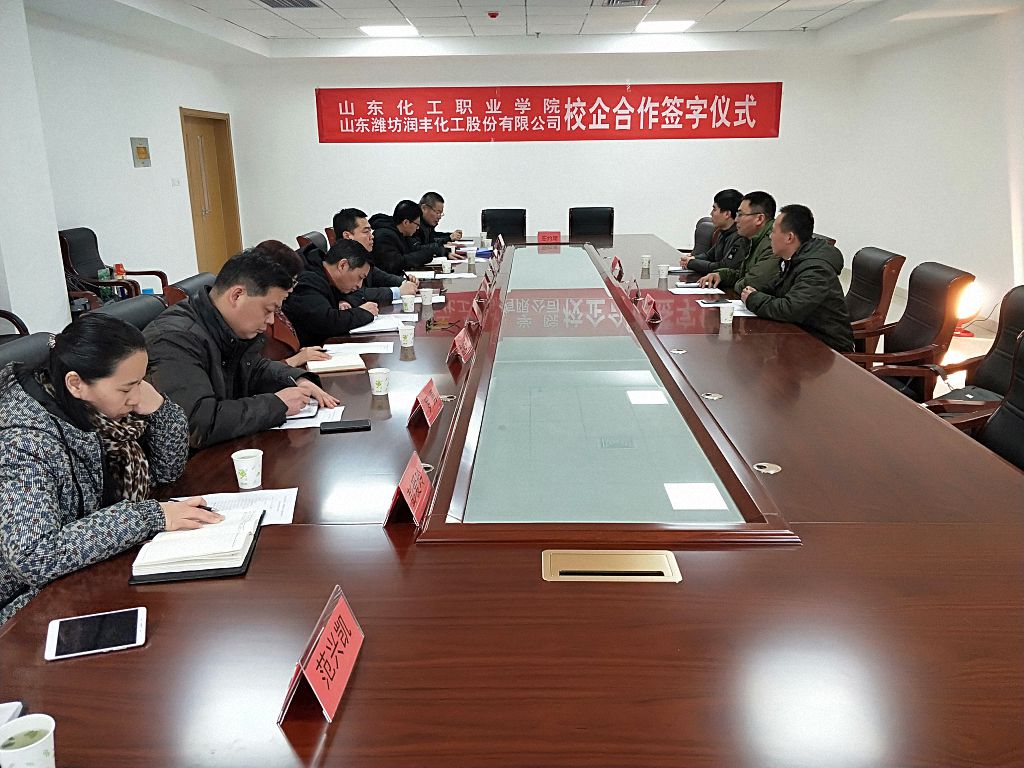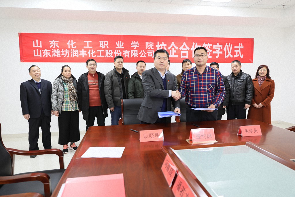 1月17日,山东化工职业学院与山东潍坊润丰化工股份有限公司举行校企合作签约仪式。山东化工职业学院纪委书记耿晓明与山东潍坊润丰化工股份有限公司人力发展中心经理毛彦英共同在合作协议上签字。