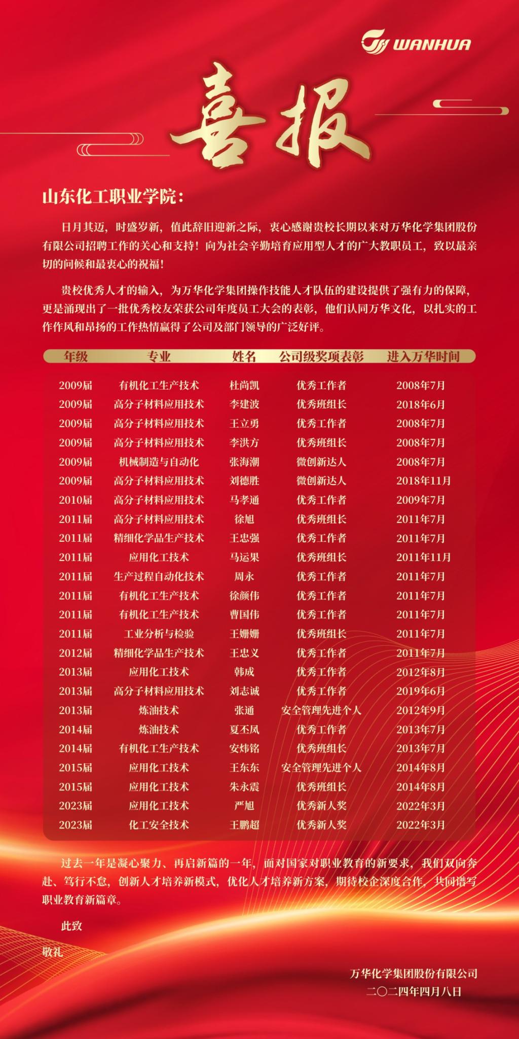本次万华化学集团股份有限公司表彰,是在2023年度员工表彰大会上,从全球近3万多员工评选出了此批次优秀毕业生。优秀毕业生中杜尚凯等11人被评为优秀工作者,李建波等7人被评为优秀班组长,刘德胜、张海潮被评为微创新达人,张通、王东东被评为安全管理先进个人,严旭、王鹏超被评为优秀新人奖。这些成绩不仅为他们个人赢得了荣誉,也为母校增添了光彩。