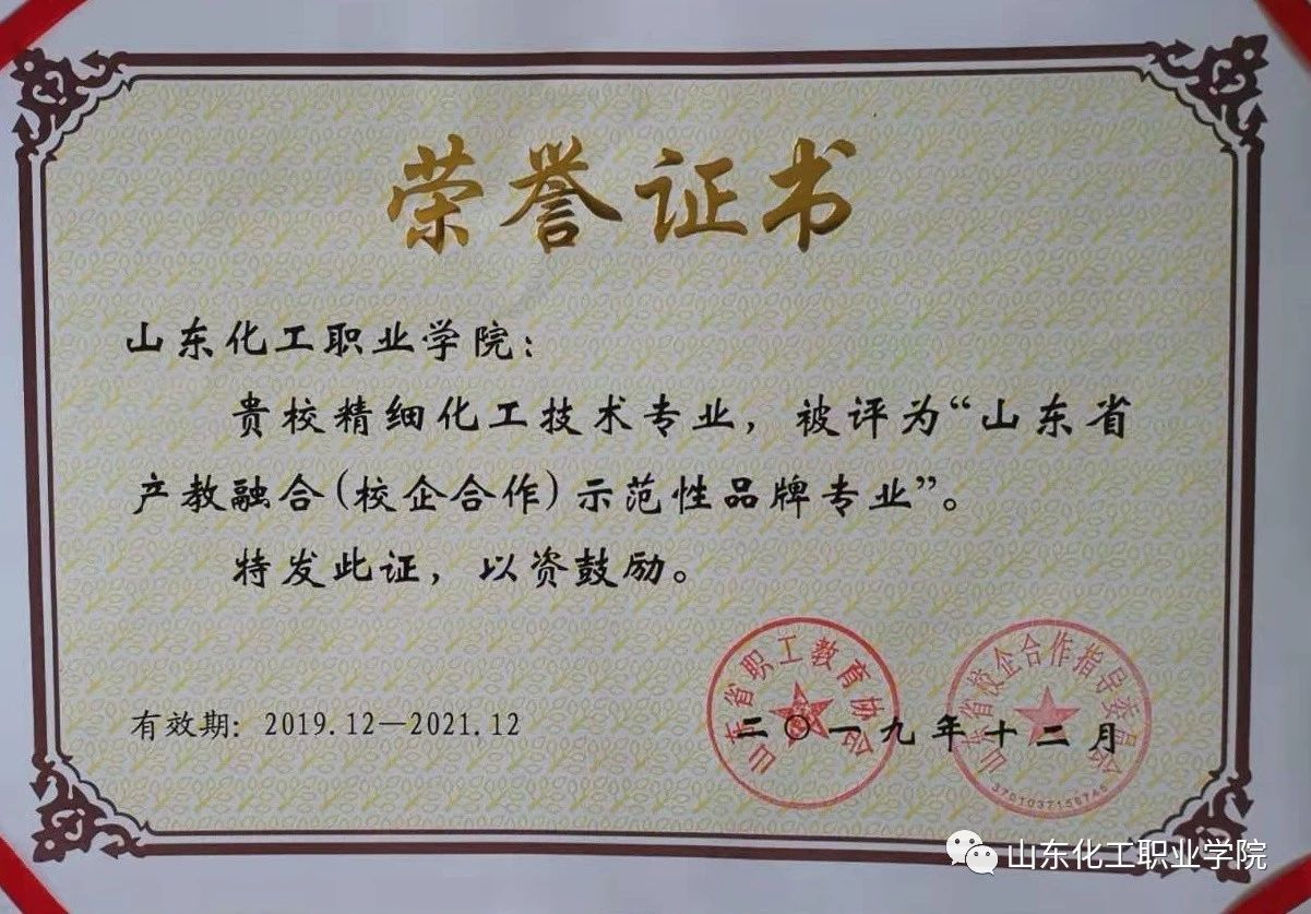 12月27日,山东省职工教育协会、山东省校企合作指导委员会联合通报表彰了2019年山东省产教融合(校企合作)示范单位、山东省职工与职业教育领军人物、山东省产教融合(校企合作)示范性品牌专业、山东省企业培训与职工教育重点课题研究工作先进单位、山东省企业培训与职工教育重点课题研究工作先进个人,山东化工职业学院获得多项荣誉。